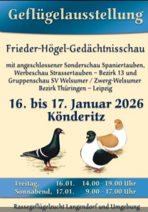 Wir sprachen auch über unsere Gruppensonderschau, welche in diesem Jahr am 15. + 16.11.2025 in Wasserleben, das liegt im Landkreis Harz, stattfindet und der Kreisrassegeflügelschau angeschlossen ist. Auch die Hauptsonderschau in St. Märgen, war ein Thema. Der Vorsitzende wies auf den Meldeschluss am 25.11.2025 hin. Diesen Termin sollte kein Zuchtfreund verpassen, denn immerhin haben 9 Zuchtfreunde unserer SV-Gruppe vor, ihre Tauben in St. Märgen auszustellen. Dies ist doch sehr erfreulich, denn St. Märgen liegt nicht gerade hier um die Ecke. Aber die Hauptsonderschau ist das jährliche Highlight für uns Thüringer Farbentaubenzüchter, was einfach Spaß macht und da nehmen wir Züchter auch schon mal lange Anfahrtswege in Kauf.